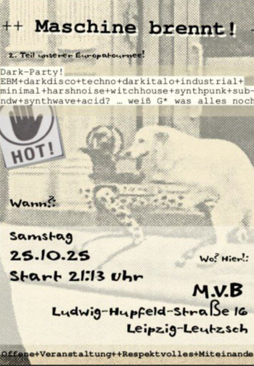 Mit einer wilden Mischung aus darkwave-orientierter, elektronischer Tanzmusik bis zu punkigen Sub-NDW Geschichten fahren wir am 25.10 im m.v.b. hoch bis die Maschine brennt! Es wird also düster treibend bis kurios minimalistisch.